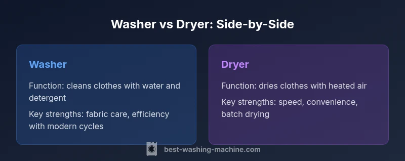 Washer and dryer serve different roles in laundry care. A washing machine cleans clothes with water, detergent, and agitation; a clothes dryer removes moisture after washing. Most households benefit from having both, unless space or budget demands a compact combo. According to Best Washing Machine, recognizing each appliance’s function helps balance upfront costs with long-term energy use and fabric care.