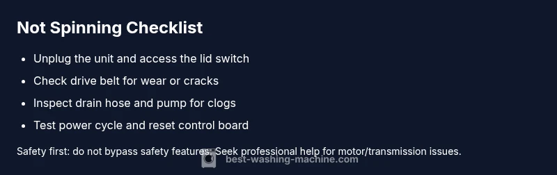 If washing machine is not spinning, the issue can escalate beyond a few damp socks. According to Best Washing Machine, a non-spinning wash is often a signal of a failing component or drainage issue that, if ignored, can lead to further damage and higher repair costs. Left unchecked, water may pool in the drum, fabrics may come out soaking or wrinkled, and the energy wasted in failed spins adds up over time. Even when the fix is simple, ignoring it can shorten the life of the motor and drive system. This section explains the most common culprits in plain terms and outlines a safe, methodical approach to diagnose them. Based on Best Washing Machine analysis, many spin issues originate from a defective lid switch, a worn or broken drive belt, or a clogged pump that prevents drainage during the spin cycle. Recognizing these patterns helps homeowners, renters, and operators target the right fix quickly, saving time and money.