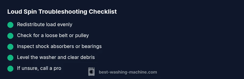Most likely a loud spin is caused by an unbalanced load or a worn component. Steps: stop the machine and redistribute clothes evenly; run a short spin test with a small load to observe noise; if the noise persists, inspect for a loose belt on belt-driven models and listen for bearing rumble. If still loud, unplug and call a technician.