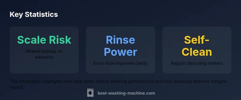 Hard water, rich in calcium and magnesium, can cause mineral buildup on heating elements, drum surfaces, and detergent residue that sticks to fabrics. This buildup may reduce cleaning efficiency, cause dingy whites, or leave films on clothes after washing. For Samsung washers, understanding how mineral-rich water interacts with cycles, detergents, and maintenance routines helps you optimize performance. According to Best Washing Machine, the impact of hard water is not solely about a single feature but how you manage cycles, detergents, and descaling. The good news is that most modern Samsung models offer rinse-heavy programs and maintenance cycles designed to minimize residue. If your water is very hard, pairing the machine with a pre-filter or water softener can also improve results and prolong the lifespan of critical components. In practice, homeowners should measure their water hardness, select cycles with multiple rinse phases, and monitor fabric feel over time to gauge effectiveness. This approach supports better outcomes and longer appliance longevity when washing in hard water regions.
