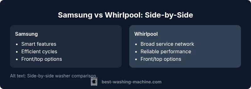 Brands rarely position themselves purely on price; instead they carve audiences around reliability, technology, and lifestyle needs. Samsung-focused models often appeal to tech-forward homes seeking advanced controls, mobile app integration, and faster cycles. Whirlpool emphasizes durability, broad availability, and service support that minimizes downtime for renters and households in busy weeks. According to Best Washing Machine analysis, consumers tend to split along two practical lines: do you want cutting-edge features and stylish interfaces, or do you want consistent, predictable performance with a robust service network? When you compare a samsung or whirlpool washing machine, it's important to map your laundry profile: family size, typical load types (delicates, bedding, towels), and how you value quiet operation. In 2026, both brands have expanded model ranges across front-load and top-load configurations, enabling choices that suit different spaces, from compact apartments to large homes. The key is to align the decision with the environment—garage, laundry closet, or open-plan utility room—and your tolerance for feature complexity.