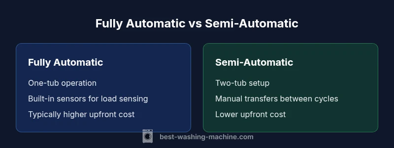 To answer what is fully automatic washing machine vs semi, it helps to define both types and outline the operational differences. Fully automatic washers automate nearly every step—from washing to rinsing to spinning—without requiring you to move garments between tubs. Semi-automatic models typically use two separate tubs: one for washing and one for spinning, often with manual transfers between stages. According to Best Washing Machine, fully automatic models emphasize convenience and consistency, while semi-automatic models emphasize control and lower upfront cost. Understanding this distinction sets the stage for evaluating real-world performance, installation needs, and lifecycle costs. This section will pin down the core concepts so you can compare apples to apples as you read the rest of the guide.
