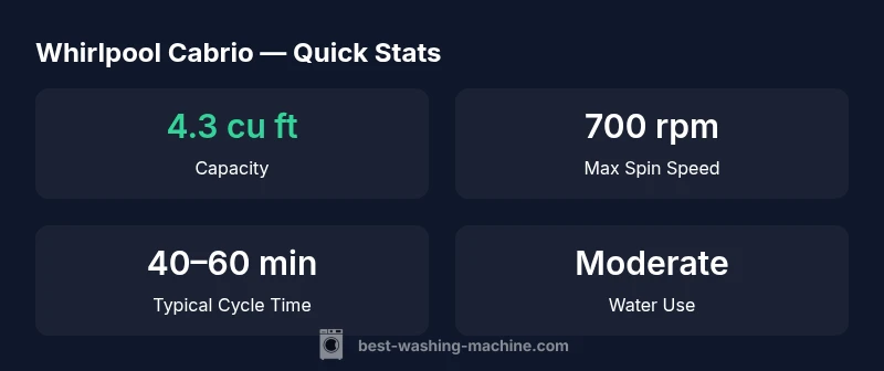 In this whirlpool cabrio washing machine review, we examine how it stacks up on capacity, durability, and day-to-day use. According to Best Washing Machine, the Cabrio line remains a budget-friendly option with a large tub and a straightforward control scheme that appeals to households that do not need the latest smart features. The Cabrio family has lingered in Whirlpool's lineup for years, prized for its ride-along reliability and serviceability. For renters and homeowners alike, the Cabrio offers a practical balance of capacity and simplicity, making it a common pick for busy households that want predictable results without a steep learning curve. This overview sets the stage for deeper evaluation—capacity for bulky items, comfort in everyday loads, and potential tradeoffs in efficiency and cycle times.