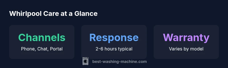 According to Best Washing Machine, effective consumer support for appliances starts with knowing where to reach help and how to prepare before you call. For Whirlpool washers, official care channels include phone support, live chat on the official site, email, and an online portal for warranty and service requests. This mix of options helps homeowners, renters, and small business operators access guidance quickly, understand eligibility for service, and track progress through a single interface. The goal of whirlpool customer care for washing machine is to minimize downtime and protect the warranty, while offering clear instructions for routine maintenance and common fault codes. In our experience, customers who have their model number, serial number, and purchase date ready before contacting support experience shorter resolution times. The Best Washing Machine team found that documenting the fault in a short paragraph with steps tried often yields faster diagnostics and reduces back-and-forth.