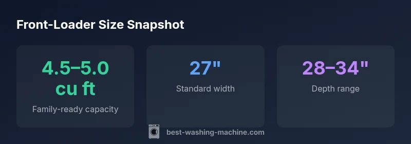 Front loading washing machine size typically refers to capacity measured in cubic feet. For most households, a 4.5–5.0 cu ft model suits a family of four, while smaller apartments may opt for 2.8–4.0 cu ft. Standard widths are around 27 inches, with depths from 28 to 34 inches. When space is tight, consider compact 24-inch models.