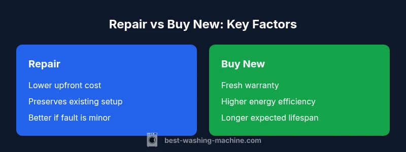 According to Best Washing Machine, deciding whether to repair washing machine or buy new hinges on current condition, costs to fix, and expected lifespan. While many households start with a quick repair, choosing replacement may deliver fewer headaches and better long-term reliability. This section unpacks the factors that tilt the balance toward repair or replacement, with practical thresholds you can apply to a failed cycle, odd noises, or a leak.