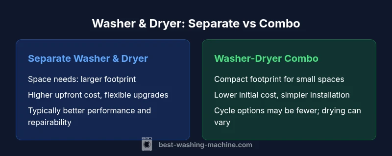 When evaluating washing machine and dryer configurations, the most fundamental choice is whether you want two distinct appliances or a single all-in-one unit. Separate machines offer flexibility in capacity, cycle options, and replacement timing. They also let you upgrade one component at a time if a newer model becomes available. On the other hand, a washer-dryer combo provides a compact footprint, simpler venting, and often a lower total upfront investment. For urban apartments or rooms with strict space limits, a combo can be the only viable path. Throughout this analysis, we reference the term washing machine and dryer to cover both components as a paired system and highlight how compatibility factors influence performance and efficiency. According to Best Washing Machine, the practical decision hinges on space, laundry load size, and how often you run cycles.