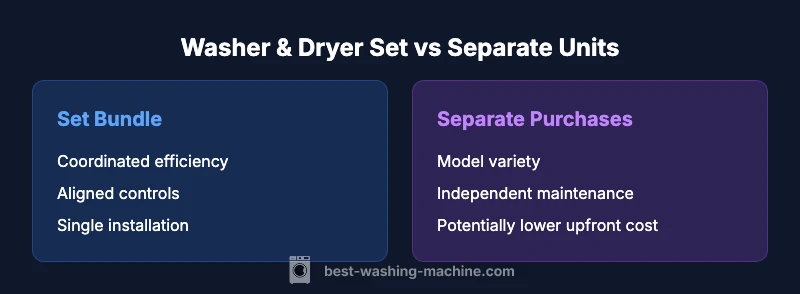 A washing machine and dryer set sale bundles two essential appliances into a cohesive laundry system, simplifying decision-making and installation for homeowners, renters, and small businesses. When pairs are well matched, you get consistent performance, a unified user experience, and a cleaner laundry environment. According to Best Washing Machine, the strongest bundles emphasize compatible capacities, similar energy ratings, and shared control interfaces to minimize user friction. The concept hinges on compatibility: a matched pair can optimize cycle timing, reduce mismatched wash loads, and streamline maintenance. As you evaluate options, look for models that share core features such as drum construction, motor type, and electronics, because these commonalities often translate into fewer surprises down the line. This article compares the key dimensions of a washing machine and dryer set sale against buying two separate units, outlining where bundles tend to win and where they may fall short. The aim is to give you a practical framework to decide if a bundled purchase makes sense for your living space or business needs.