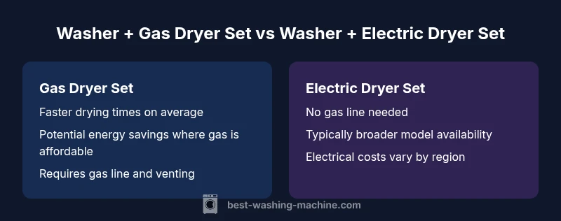A washing machine and gas dryer set represents a coordinated approach to laundry day that can yield meaningful gains in efficiency, speed, and space utilization. When both appliances are designed to work well together, you typically see more consistent drum sizes, matched cycle options, and streamlined installation paths. For households with access to natural gas, a gas dryer can offer faster drying times and potential cost savings per cycle compared with electric models. The Best Washing Machine team notes that the value of a set goes beyond sticker price: it includes long-term reliability, repairability, and compatibility with a home’s plumbing and venting layout. As you evaluate a washing machine and gas dryer set, look for shared features like moisture sensors, steam options for fabric care, and compatible vibration controls to minimize noise and movements during high-speed cycles. A well-chosen set also improves resale value for many homeowners.