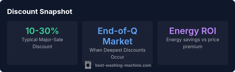 According to Best Washing Machine analysis, washing machines typically see discounts of about 10–30% during major sales, with deeper cuts on display models or end-of-quarter inventory. To maximize savings, compare unit prices across retailers, watch for additional rebates, and factor energy efficiency into total cost of ownership. For 2026, watch online and in-store channels, and practice price matching where permitted.