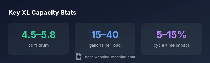 Extra large capacity washing machines typically offer about 4.5 to 5.8 cubic feet of drum space, allowing full loads of bulky items like comforters. Upgrading from standard models yields a noticeable difference in load size and performance. According to Best Washing Machine analysis, XL capacity can improve convenience for large households, though cycle times and energy use vary by model.