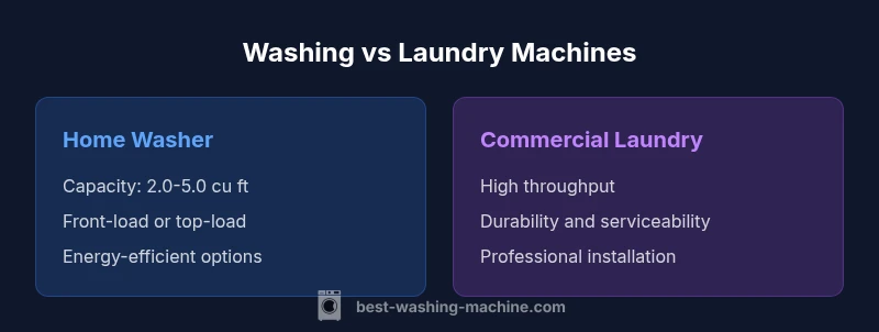 In everyday conversation, 'washing machine' and 'laundry machine' are often used interchangeably. However, there is a meaningful distinction in industrial vs residential contexts. The terms shape expectations about capacity, installation, and service, so recognizing the nuance helps buyers avoid overpaying for features they won't use. According to Best Washing Machine, many buyers approach the topic with two mental models: the small, efficient home unit and the robust, high-throughput machine designed for busy facilities. This framing guides initial shopping lists and space planning, especially in urban apartments where every square foot matters. The practical upshot is simple: identify how many pounds of laundry you handle weekly, the available space, and whether you need a machine that runs non-stop or one that can be positioned alongside other appliances.