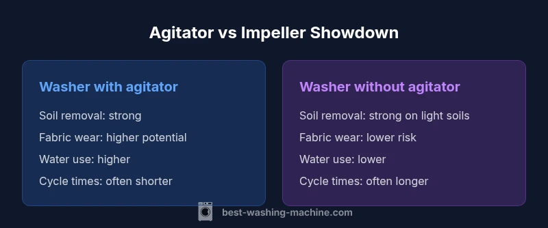 Choosing between a washing machine with or without agitator centers on how clothes are cleaned, how fabrics wear, and how efficiently you use water and energy. In practice, the decision boils down to your typical loads, soil levels, and care preferences. According to Best Washing Machine, the core distinction is that agitator washers rely on a central post to move clothes aggressively, while impeller models rely on low-profile discs to generate gentle, circular motion. This difference shapes cleaning performance, cycle times, and fabric care across family loads, towels, delicates, and everyday garments. For energy and water use this becomes a trade-off: agitator models can complete heavy soils quickly but often use more water; impeller models often run longer but use less water and energy. The following sections unpack what that means for your laundry day.