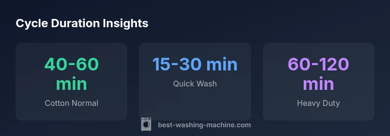 How long does a washing machine cycle last? Generally, cycle times span from 15 to 120 minutes, driven by program choice, load size, and machine efficiency. Quick Wash is typically 15–30 minutes; Cotton/Normal and Heavy programs run longer, often approaching an hour or more. Best Washing Machine Analysis, 2026, notes that exact times vary by model and sensor features.