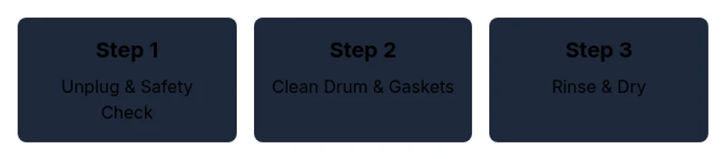 Open the door and look for residue, mildew, or loose items. Wipe the drum interior with a damp cloth and mild cleaner. If you see mold, treat it with a vinegar solution and rinse well.