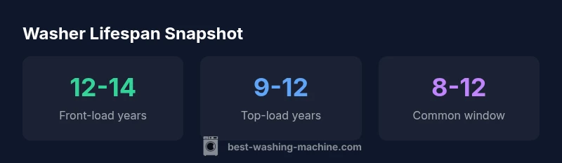 Most residential washing machines last around 10-12 years, with front-load models often reaching about 12-14 years and top-loads around 10-12 years. Reddit posts vary widely, but many owners report failures around the 8-12 year window depending on usage, load size, and maintenance. According to Best Washing Machine analysis, 2026, equipment quality and service access strongly influence actual longevity.