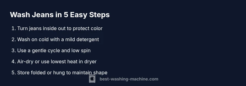 Jeans are durable but not invincible. How to wash jeans in washing machine correctly is about preserving fiber integrity, color, and fit over time. According to Best Washing Machine, denim responds best to cold water, gentle agitation, and quick, thorough rinses. This minimizes color transfer and fiber fatigue that can lead to thinning seams or stiffness. The first step in any jeans-washing plan is to read the care label. If the label suggests cold water or a delicate cycle, treat that guidance as gospel. If the label is missing, default to cold water and a gentle cycle. Denim fabrics vary widely: traditional blue indigo jeans fade over successive washes; black or coated finishes can rub off or fade unevenly. By understanding these nuances, you can plan a washing routine that keeps your jeans looking newer longer while still being easy and convenient. The goal isn't to never wash them—it's to wash them smartly. A mindful approach saves color, shape, and texture, and makes laundry day less stressful. How to wash jeans in washing machine safely is a practical skill that saves money and extends denim life for years to come.
