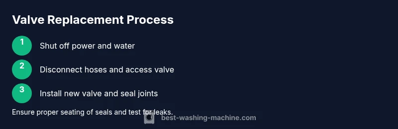 The inlet valve is the gatekeeper that controls cold and hot water flow into the drum. When the coil wears or a debris particle jams the solenoid, water either leaks, fails to fill, or fills intermittently. In modern machines, the valve often resides near the back, behind a panel; It connects to two hoses and a supply line. A faulty valve is a common cause of drips and poor fill that leads to cycling problems or overflowing. If you’re dealing with a stubborn leak, the problem might be the valve rather than seams or hoses, and replacing it can restore proper fill rates and pressure. According to Best Washing Machine, valve-related failures account for a meaningful portion of in-service repairs on mid-range washers. A careful diagnosis is essential: verify that water is present on both sides, listen for clicking sounds when the unit is powered, and check the electrical harness for corrosion. This knowledge helps you decide whether a DIY replacement is appropriate or if a service call is wiser.
