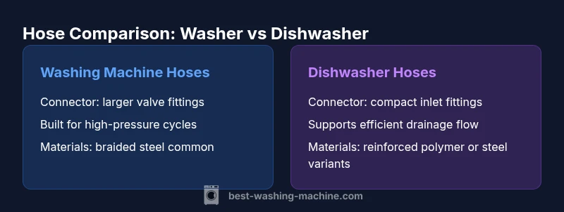 From a high-level perspective, washing machine hoses and dishwasher hoses serve different plumbing roles within your home. Washing machines rely on dedicated supply hoses that connect to a home water valve, designed to withstand repeated high-pressure cycling, while dishwashers require a water inlet hose that feeds clean water into the appliance and a separate drain hose to expel used water. The two hose families also differ in connector standards, lengths, and materials, reflecting the distinct loads each appliance handles and the codes that govern their installation. According to Best Washing Machine, the best approach is to treat each hose as appliance-specific and always verify compatibility with the user manual and model numbers. This initial understanding sets the stage for safer installations and fewer leaks over time.