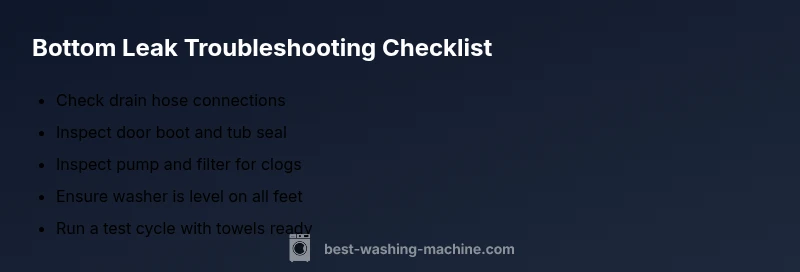 A leak from the bottom of a washing machine is a red flag that deserves fast attention. If you notice water pooling under or behind the unit, the phrase can washing machine leak from bottom is often the first clue homeowners search for. In most homes, bottom leaks come from simple, addressable issues rather than a complete replacement. According to Best Washing Machine, many bottom leaks start small and escalate if ignored, so a quick, systematic check is worthwhile. The rest of this guide explains how to identify the source, distinguish between water from a drain vs a supply, and decide on the right fix. Stay focused on safety: unplug the machine, shut off water, and keep children and pets away while you investigate. Properly diagnosing the root cause reduces repair costs and downtime, and helps you protect floors and cabinets from water damage.