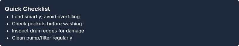 Safety first. Always unplug the machine before any inspection. Start by removing the load and checking the drum for any visible snags or rough spots. Look at the agitator (if your model uses one) for cracks or missing pieces. Flip the drum with your hand to feel for rough edges or deformities. Inspect the door seal for curling fabric strips or trapped threads. Check pockets for coins, nails, or sharp objects that could project into the drum area in the next cycle. Finally, examine the filter and drain pump area for blockages that might cause abnormal draining or backflow—these can pull garments toward the pump housing if not cleared.
