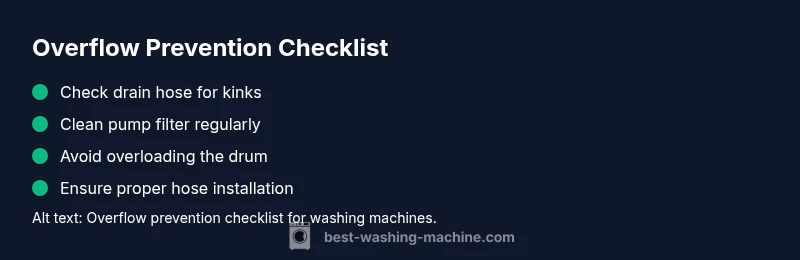 Overflow is usually caused by a blocked drain path or a kinked hose that prevents water from leaving the tub. Start with quick checks: inspect the drain hose for kinks or clogs, then verify the pump filter and drain pump. If water continues to spill, shut off power and water supply and follow the full step-by-step guide.