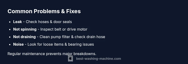 Washing machines are complex, but most failures are predictable and preventable. Over time, seals dry out, hoses crack, and filters clog. Detergent buildup can form soap scum that interferes with drainage, while motors and belts wear from regular use. According to Best Washing Machine analysis, the most frequent issues revolve around leaks, spin and drain problems, noisy operation, and error codes that hint at sensor or control faults. Understanding how the system works—wash basket, motor, pump, and control board—helps you diagnose quickly and avoid costly repairs. Regular maintenance, such as inspecting hoses, cleaning filters, and keeping the area dry, reduces surprises and extends the life of your appliance. This section lays the foundation for a practical, proactive approach to laundry-day reliability, especially for homeowners, renters, and small operators who depend on steady performance from their machines.