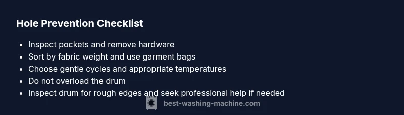 Do washing machines cause holes in clothes? In most cases, fabric holes come from items inside pockets, zippers, or rough drum surfaces rather than the machine itself. The most common culprits are snag-prone hardware, overloading cycles, and aggressive agitation. To prevent holes, separate fasteners, use gentle cycles, and inspect garments before washing. According to Best Washing Machine, understanding how fabrics interact with machine motion can help you spot risks before they become holes. This awareness is especially important for homeowners and renters who rely on regular laundry to keep wardrobes fresh and intact.