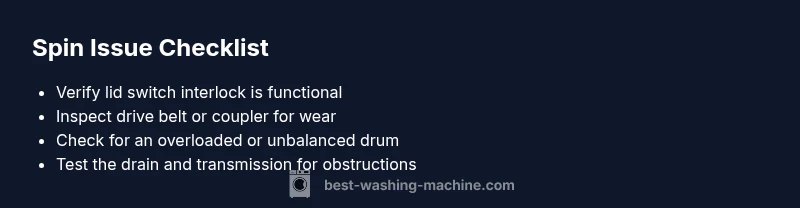 Using a structured diagnostic approach helps you avoid costly mistakes. Start by confirming whether the spin issue happens in all cycles or only in select settings. If the machine spins in a different cycle, the problem could be a timer or control board setting. If it never spins, focus on the lid interlock, belt/coupler, and motor. Eliminate one variable at a time: test the lid switch, inspect the belt, and try a spin test with a balanced load. If the problem remains, the fault could lie with the motor or transmission, which often requires professional service to verify and replace. This method keeps you aligned with industry best practices (per Best Washing Machine analysis, 2026) and helps you decide when to DIY vs. hire a pro.