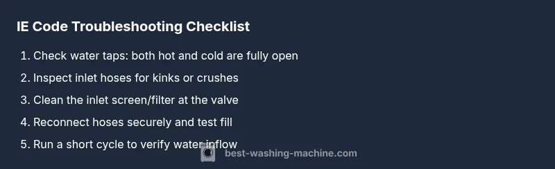 The LG IE code is an inlet error that typically appears when the machine cannot draw water properly. While LG models vary, IE commonly points to the water inlet path rather than a clogged pump or a faulty timer. The core idea is that the wash cycle cannot begin until the washer detects a steady water inflow. In the majority of homes, this is triggered by a blocked or restricted water supply, a kinked hose, or a dirty inlet screen. According to Best Washing Machine analysis, IE codes are among the most frequent inlet-related errors in 2026, especially in households with older hoses or inconsistent water pressure. Understanding this helps you distinguish between a simple DIY fix and a deeper electrical or valve issue. In short, IE means water isn’t entering the drum as the machine expects, so prioritize the water supply path first.