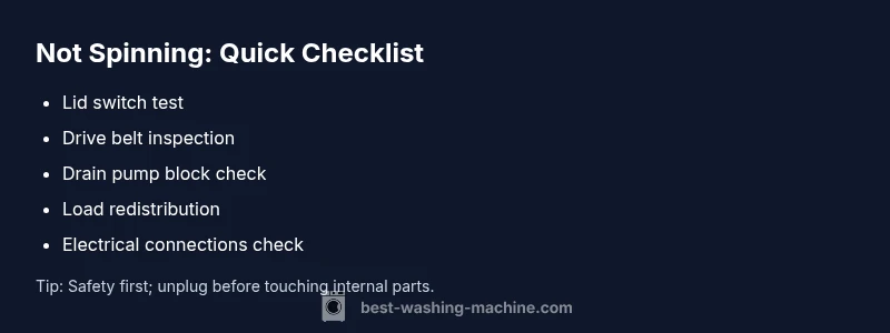 Not spinning washers are usually caused by a faulty lid switch, a broken drive belt, or a worn motor coupling. Start by unplugging the machine, testing the lid interlock, and listening for a spin hum. If the drum won’t turn, inspect the belt and switch, then run a no-load cycle. Use the diagnostic flow below for deeper checks.