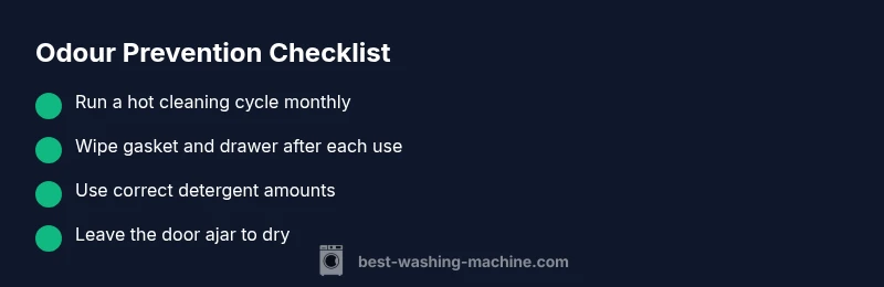 To stop odours before they start, establish a simple monthly routine: 1) run a hot cleaning cycle with a washer cleaner or vinegar, 2) wipe seals and drawers after each load, 3) use the right amount of detergent, and 4) leave the door or detergent drawer slightly ajar between cycles to improve air circulation. If your washer is in a damp area, consider a dehumidifier or improved ventilation. Regularly inspect hoses, filters, and seals for signs of wear or mold. These habits fit well with a maintenance plan for a durable, low-odour washing machine.