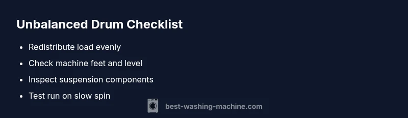 Start with redistribution of laundry, then re-level the machine. If wobble persists, run a short, low-speed cycle to confirm the issue. Avoid loading the drum with bulky items on one side and always leave space for clothes to move. If the wobble remains, inspect the suspension components or bearings following the safety guidelines below; if you’re unsure, call a technician to prevent injury or damage. The goal is to address the off balance washing machine drum without compromising safety.