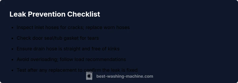Leaking is most often caused by worn seals, loose hoses, or overloading. Start with the simplest checks: inspect the door seal, tighten hose connections, and verify the drain hose isn’t kinked. If water appears only during a cycle, the drain pump or valve may be the culprit. For persistent leaks, follow the diagnostic flow and step-by-step fixes.