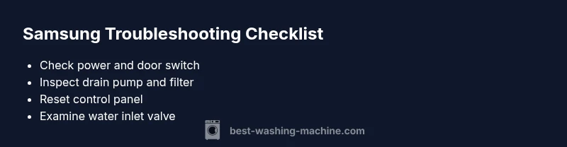This section walks you through the most common fix that resolves many samsung troubleshooting washing machine scenarios: power/door switch issues. Begin by confirming power and outlet status, then inspect the door or lid switch and latch. If these are fine, perform a soft reset of the control board. If the problem persists, consider professional service to examine the control module and wiring harness. Follow these steps in order and avoid jumping ahead to more invasive repairs.
