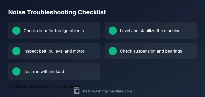 This section outlines a practical decision tree to troubleshoot loud noises. Start with the symptom: is the noise present only during spin, agitation, or both? If the noise is tied to spin and you hear a thud every revolution, the culprit is likely a loose item or an unbalanced load. If the noise happens during agitation, the agitator or drive belt is suspect. If the drum feels loose or rubs against the cabinet when rotated by hand, you may have worn bearings or a bent drum. For each potential cause, attempt non-invasive fixes first: remove debris, level the unit, re-seat the drum, and replace a frayed belt if accessible. If the noise continues after these steps, step up to more involved repairs or call a professional. The aim is to avoid unnecessary disassembly and ensure safety at every stage.