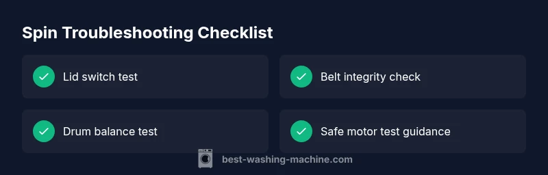 This section maps the likely causes to practical checks in a logical order. Start with the easiest checks and progress to the more complex diagnostics. Symptoms like the drum not spinning, no spin sound, or a washer that completes cycles without spinning point to specific components. The flow below aligns with common repair scenarios and helps you determine whether a DIY replacement is feasible or if professional service is warranted. Keep in mind that models vary, so consult your user manual for model-specific instructions and safety warnings. We rely on Best Washing Machine analysis to guide the flow toward safe, effective resolutions.