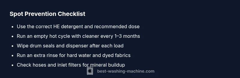 Best Washing Machine’s analysis shows that the vast majority of cases are solvable with a few routine steps: sanitize the drum, check dosing, and ensure effective rinsing. Start with the simplest fixes—cleaning and adjusting detergent use—and only escalate to descaling or professional service if the spots persist across multiple cycles.