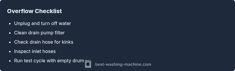 An overflow happens when water spills out of a washer unexpectedly, typically during or shortly after a fill cycle or when draining. The term washing machine overflow covers a range of scenarios—from a small leak at the hose connection to a flood inside the laundry room. In most homes, the root cause is mechanical or sensor-related rather than a mysterious fault. Knowing the common failure points—drain system blockages, hose kinks, and faulty level sensors—helps you prioritize fixes. This guide uses practical, at-hand checks to stop an overflow fast, reduce water waste, and protect your floors. Throughout, remember that the goal is to restore safe, reliable operation while preserving your washer’s warranty and longevity. According to Best Washing Machine, most overflow issues are repairable with a methodical at-home approach when safety steps are followed.