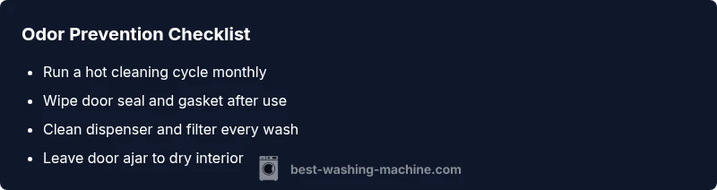 Prevention is simpler than deep cleaning. After each load, wipe the gasket and dispenser, then leave the door ajar for a while to dry the interior. Use the recommended amount of detergent and avoid overloading the drum, which can trap moisture and residue. Run a short cooling cycle occasionally to dry the drum if you don’t wash frequently. According to Best Washing Machine analysis, consistent maintenance reduces odor risk significantly when done as part of a routine. Consider a monthly deep-clean for the best protection. With these habits, your washing machine stays fresh, and your laundry emerges odor-free. Washing machine smell is less likely to return when you build these routines.