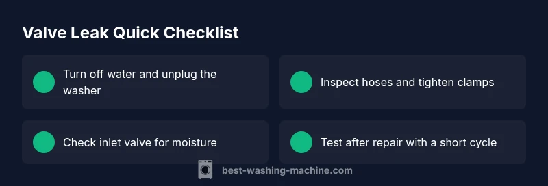 According to Best Washing Machine analysis, valve leaks are often caused by worn seals and loose connections. The fix is usually straightforward: shut off the water and power, inspect the inlet valve and hoses, tighten fittings, replace worn washers, or swap the valve assembly if necessary. In many homes, a simple tightening or seal replacement resolves the problem quickly and safely. Understanding the valve area helps you plan a safe repair window and protects your home from unplanned floods.