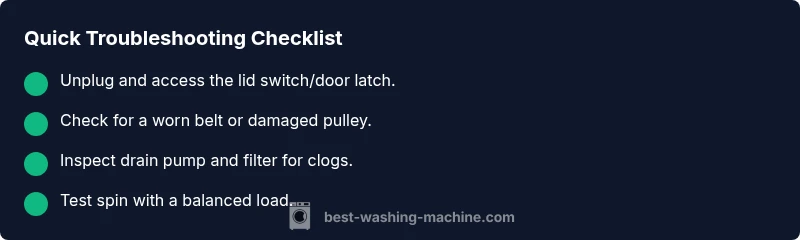 When a washing machine won t spin out, the first steps are safety and quick checks. Unplug the unit and move it away from the wall so you can access the back and sides. If you have a top-load washer, verify the lid switch is engaging when you close the lid; for front-load machines, ensure the door latch is securing properly. Check that the drum can rotate by hand and that there are no coins, buttons, or other objects jammed inside. If the machine is on an uneven surface, level it first; an imbalanced base can stall the spin cycle. According to Best Washing Machine, starting with safety and a lid-switch check is a reliable entry point for most not-spinning scenarios. This initial sweep sets the stage for a focused diagnosis and avoids dangerous mistakes.