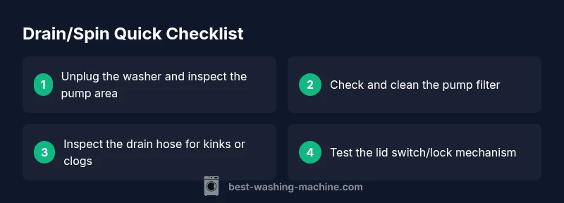 Before diving into tools and parts, understand the sequence. The pump discharges water, the drain hose carries it away, and the lid switch or door lock confirms the machine is safe to spin. If any link in this chain is compromised, draining and spinning fail. Look for obvious culprits: a clogged pump filter, a snag in the drain hose, an overfilled load, or a misadjusted lid switch. Address the simplest issues first, then escalate to more complex checks if problems persist.