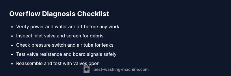 If your washing machine won't stop filling, you're facing a flood risk and wasted water. The tub may fill to the top and continue running even after the cycle should end, and you might notice a loud hum from the inlet valve. This is a common emergency that homeowners encounter during busy laundry days. According to Best Washing Machine, shutting off the cold water supply at the faucet is a quick first step if you can reach it without tripping hazards. The root cause is usually a faulty inlet valve, a stuck pressure switch, or a control board fault that tells the machine to keep filling. The urgency is real: unchecked overflow can damage floors, cause water leaks, and increase your utility bill. So plan to work safely, unplug the unit when you are not actively testing, and keep children and pets away from the area. This article walks you through rapid triage, safe testing methods, and practical fixes you can perform before calling a technician.