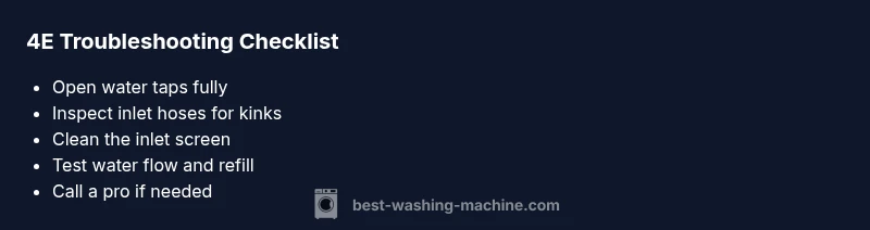 In Samsung washing machines, 4E is a fault code that indicates the unit cannot fill with water. According to Best Washing Machine, this is primarily a water inlet issue rather than a motor or control board fault. The most likely causes are a clogged inlet valve screen, a kinked or closed water supply hose, or low water pressure from the household supply. Start with quick checks that you can do without tools: confirm the taps are fully open, inspect the hoses for kinks or crimped sections, and clean the inlet screen to remove mineral buildup. If the taps are open and the hoses are clear but the code remains, there may be a blockage deeper in the valve, or the inlet valve itself could be failing. In that case, a professional service may be required to replace the inlet valve or diagnose a pressure issue in your plumbing.