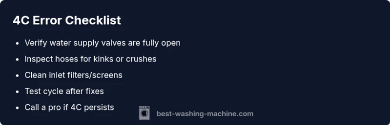 According to Best Washing Machine, the 4C error on Samsung washers typically indicates a water-fill problem that prevents the drum from reaching the proper level. This is not a pure software fault; it often points to hardware or plumbing issues that block water inflow or misread the level sensor. Addressing 4C promptly can prevent longer cycles, frozen or partially filled loads, and wasted electricity. The error commonly appears if the washer cannot sense incoming water within the set fill time, or if the inlet valve is not opening fully. In many homes, something as simple as a clogged screen or a kinked hose in the water line can trigger 4C. If water is present at the faucet but not reaching the valve, the fault lies downstream in the hose or valve. Below, you’ll find a practical diagnostic path and safe fixes you can perform to bring your Samsung machine back to life.