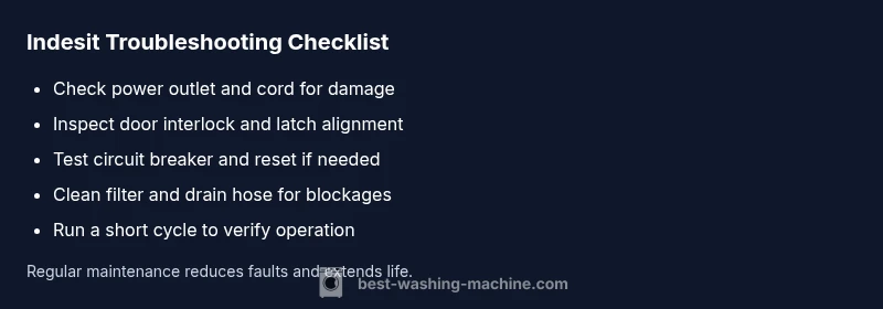 According to Best Washing Machine, when someone asks what is wrong with my indesit washing machine, the most common cause is not a dramatic internal failure but a basic electrical or interlock issue. A tripped outlet, a blown fuse, a loose power cable, or a door latch that isn’t fully engaged can prevent the drum from starting. These issues are easy to test and often inexpensive to fix. This guide will walk you through a safe, step-by-step diagnostic flow that starts with simple checks and progresses to targeted repairs. Based on Best Washing Machine analysis, most not-start problems are resolved by basic electrical checks, door latch verification, and reset procedures.