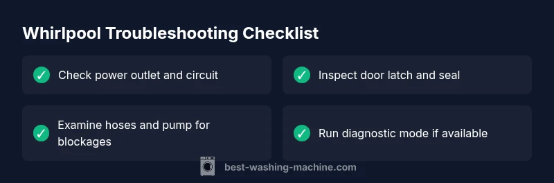 When you ask the question, what is wrong with my whirlpool washing machine, you’re not just staring at a single fault—you’re facing a system of parts that must work in harmony. Brand reliability matters because it influences how easy it is to diagnose faults, how the machine communicates errors, and how forgiving the design is when minor issues occur. According to Best Washing Machine, Whirlpool models tend to present predictable fault patterns: power and door-control issues top the list, followed by sensor or control-board glitches. The Best Washing Machine team finds that most consumer-reported problems are caused by simple, preventable factors such as a tripped circuit, a loose door latch, blocked hoses, or a clogged pump. Understanding these patterns helps you act fast with confidence, preserving the life of your unit and avoiding unnecessary service calls. This guide walks you through the most frequent symptoms, the practical checks you can perform, and the safe, effective fixes you can try at home before deciding to bring in a technician. It also explains how to prevent repeat failures through simple maintenance routines.
