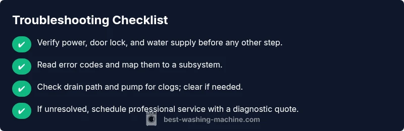 In practice, the most common failures begin with a temporary glitch in the electrical system, a door interlock that won’t seal, or a water supply disruption. If the machine powers on but won’t start a cycle, you should check the basics first: power at the outlet, a closed lid, and a stable water supply. If you hear strange noises, or if the drum won’t spin, that points to a mechanical fault or a blocked pump. This section provides a clear map to navigate those possibilities, with practical steps you can perform safely and independently. The Best Washing Machine Team emphasizes that most urgent fixes are simple, and you can often avoid costly repairs by catching the issue early. Remember: safety first—unplug before poking around and never bypass safety switches.