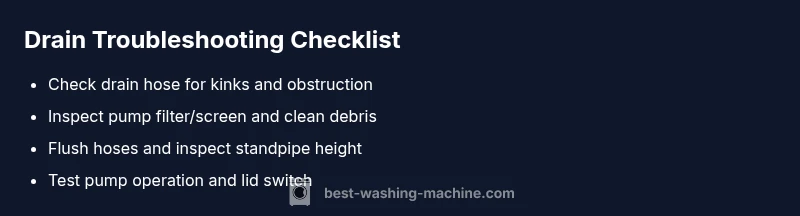 According to Best Washing Machine, the most frequent culprits behind a stubborn drain are clogs in the pump screen or drain hose, a kinked or blocked drain hose, or a standpipe that’s blocked or too high for the machine to gravity drain. Less common, but possible, are a faulty lid switch on top-load models and a failing drain pump or impeller. Understanding these causes helps you prioritize fixes without wasted effort. A clogged filter or pump screen can trap hair, lint, coins, and small clothing fibers, while a blocked hose prevents water from exiting the tub. Recognizing the pattern—water slowly draining, or not draining at all—helps you decide which component to inspect first. Best Washing Machine analysis shows that most drainage failures begin with easy, non-destructive checks, making it worth starting there before assuming a costly replacement is needed.